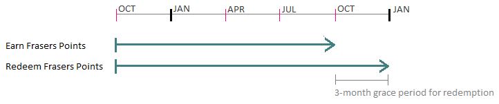 - Frasers Points can be redeemed any time from 01 October of the current year to 30 September of the following year, with a 3-month grace period thereafter.